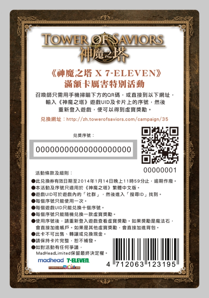 活動方式非常簡單,只要於活動期間(12/25 – 1/7),至7-ELEVEN超商不限商品單筆消費金額滿110元(菸品不列入活動品項),即可獲得pos coupon一張,憑pos coupon即可兌換《神魔之塔》虛寶卡一張。玩家只要掃瞄虛寶卡上之QR Code,接著輸入《神魔之塔》遊戲UID及卡片上的序號,就能得到《神魔之塔》好康虛寶,包括魔法石500粒、魔法石30粒、魔法石10粒、魔法石1粒、金幣50000、萬年靈魂石(款式隨機)、千年靈魂石(款式隨機)、瘋頭、人面鳥怪、機關騎士等隨機虛寶,限量1000萬張,送完為止!